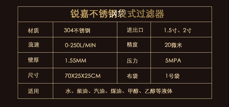 不銹鋼過濾器接口有1寸和1.5寸2種,布袋統(tǒng)一采用1號袋,如有特殊需求,可聯(lián)系我們定做13868633152。